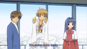 Yuuichi and Ayu go out to the balcony to stare at the disturbingly accurate skyline, and they begin conversing about random stuff. In the midst of it we learn that both of them dislike heights, which quite likely stems from the fact that one of them fell off a tree and into a coma with the other person watching. Hint: the person who fell wasn't Yuuichi; although that would be strangely interesting...